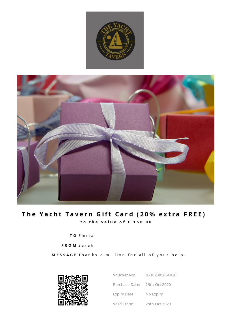 The Yacht Tavern allows you to purchase instantly printable gift vouchers, special offers and tickets using the Voucher Connect platform.